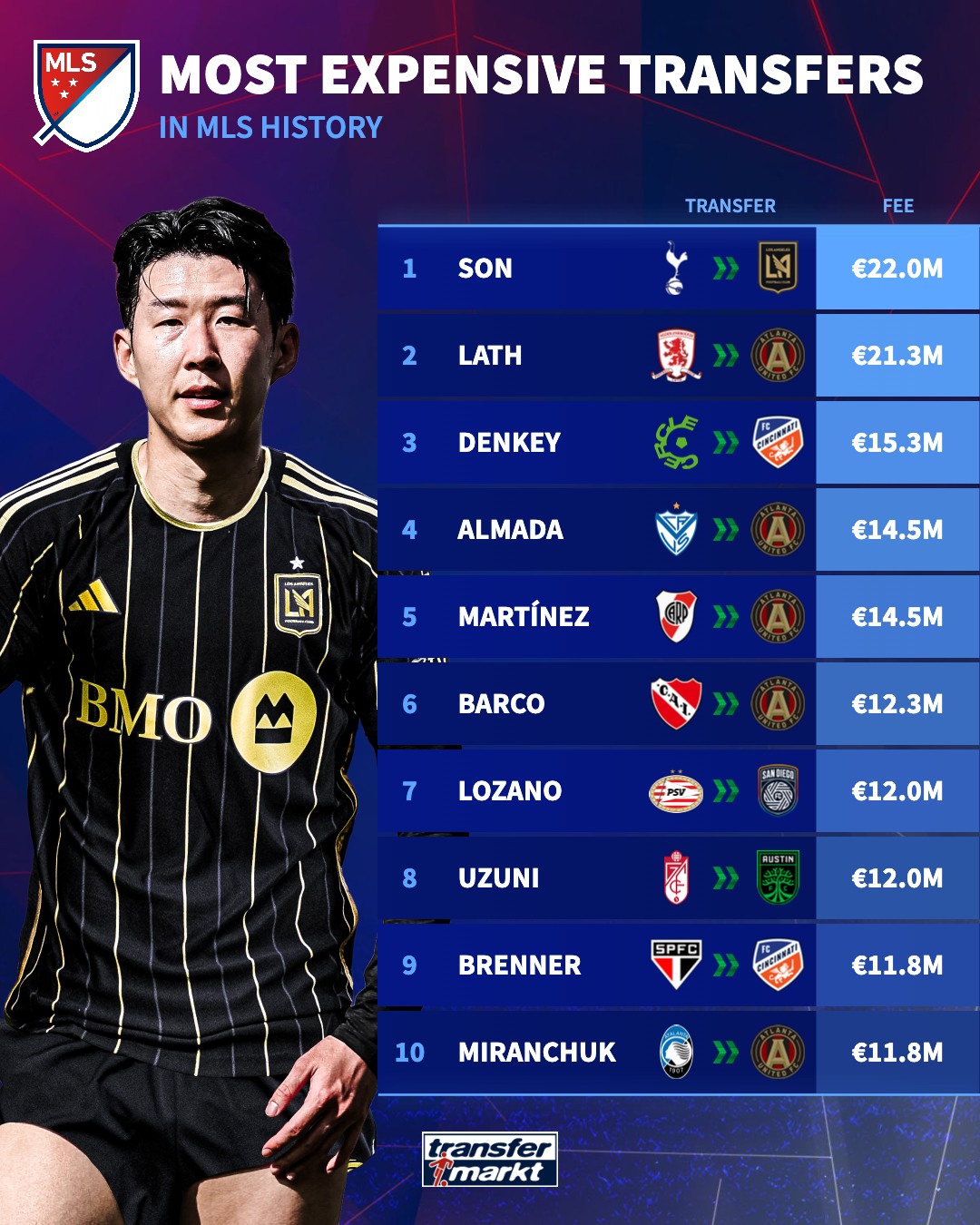 미국 언론 매체에 의하면 손흥민의 이적료는 약 2,650만 달러(한화 약 367억 원)이며, 이는 MLS 역사상 최고 이적료라고 구단은 밝혔습니다. 손흥민 영입을 통한 글로벌 마케팅 및 전력 강화에 대한 의지를 이적료로 보여주는 듯 합니다.
