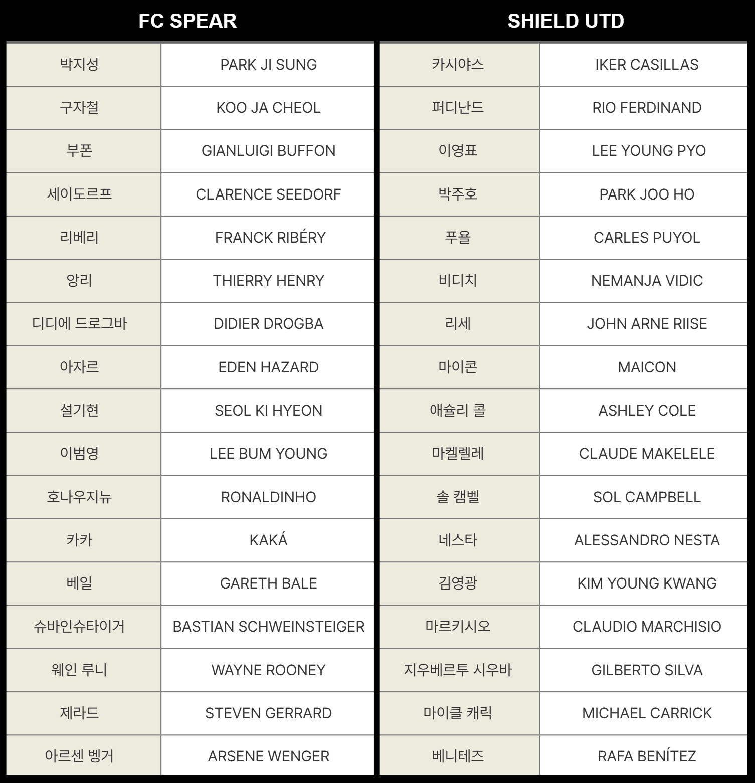 그럼, 2025년 아이콘 매치 창과 방패 팀에는 어떤 선수가 차출 되었는지 알아보겠습니다.