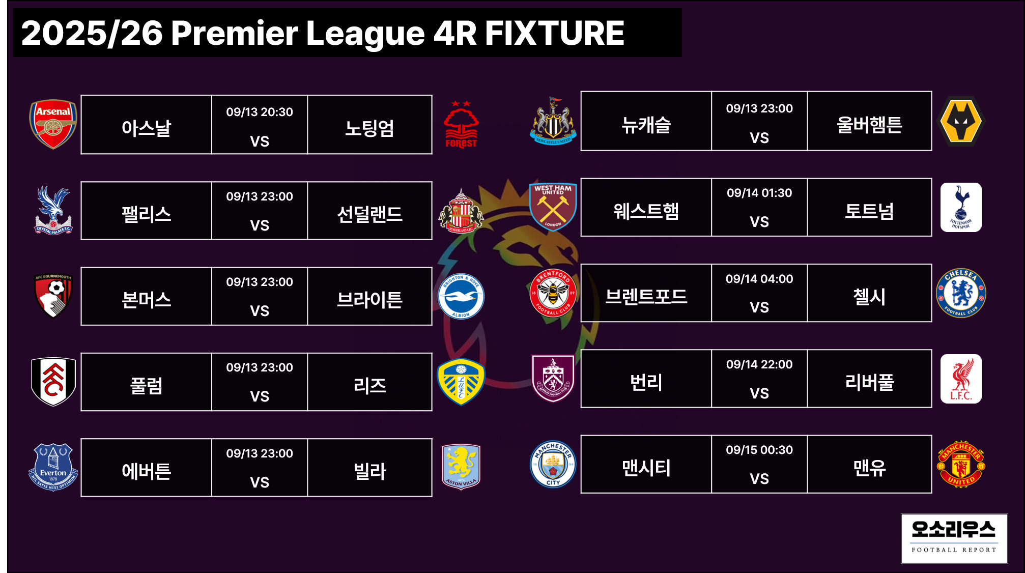 프리미어리그 4라운드는 아스날 대 노팅엄의 경기를 기준으로 시작합니다.